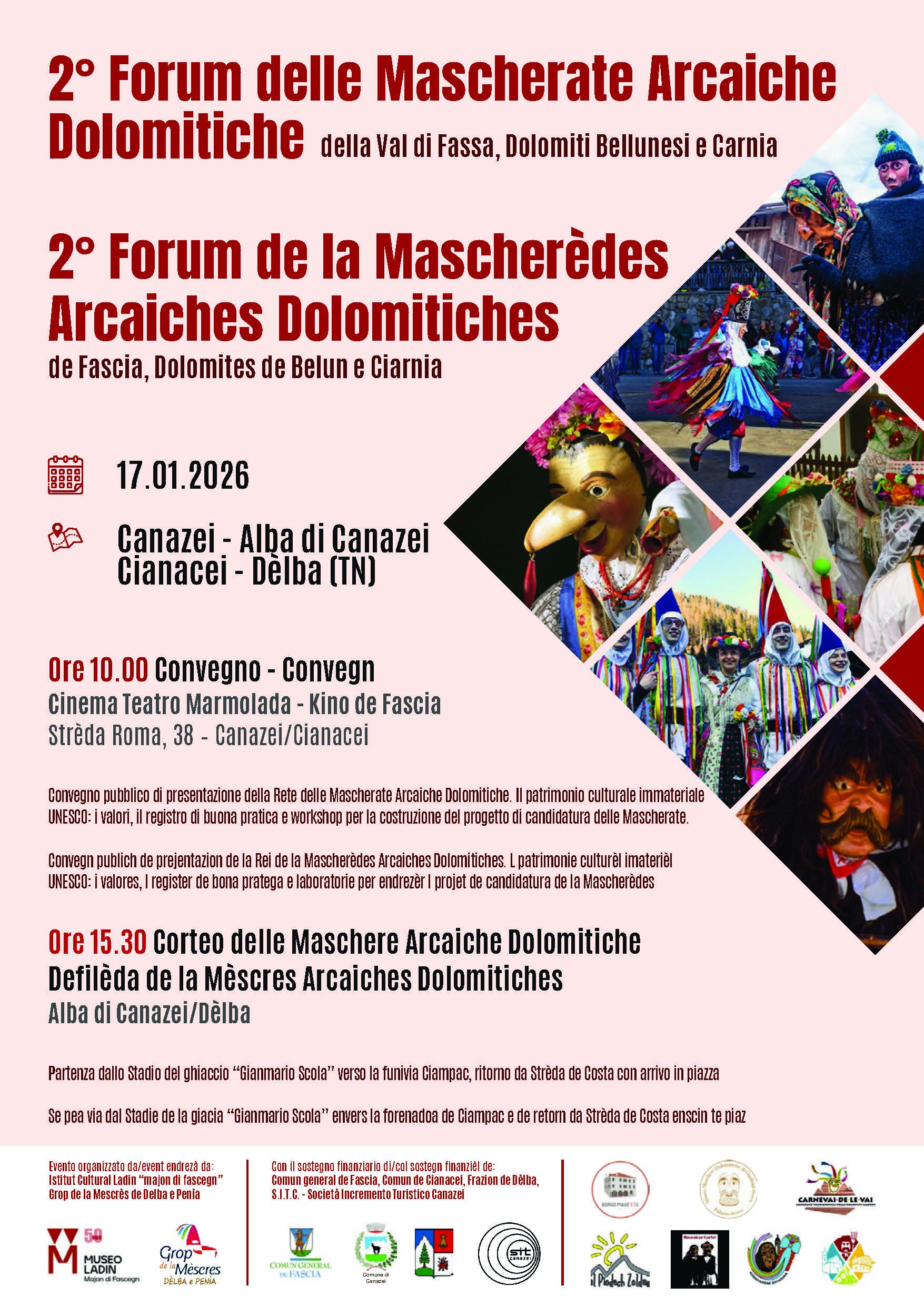 ore 10.00: Convegno pubblico di presentazione della Rete delle Mascherate Arcaiche Dolomitiche. Il patrimonio culturale immateriale UNESCO: i valori, il registro di buona pratica e workshop per la costruzione del progetto di candidatura delle Mascherate.