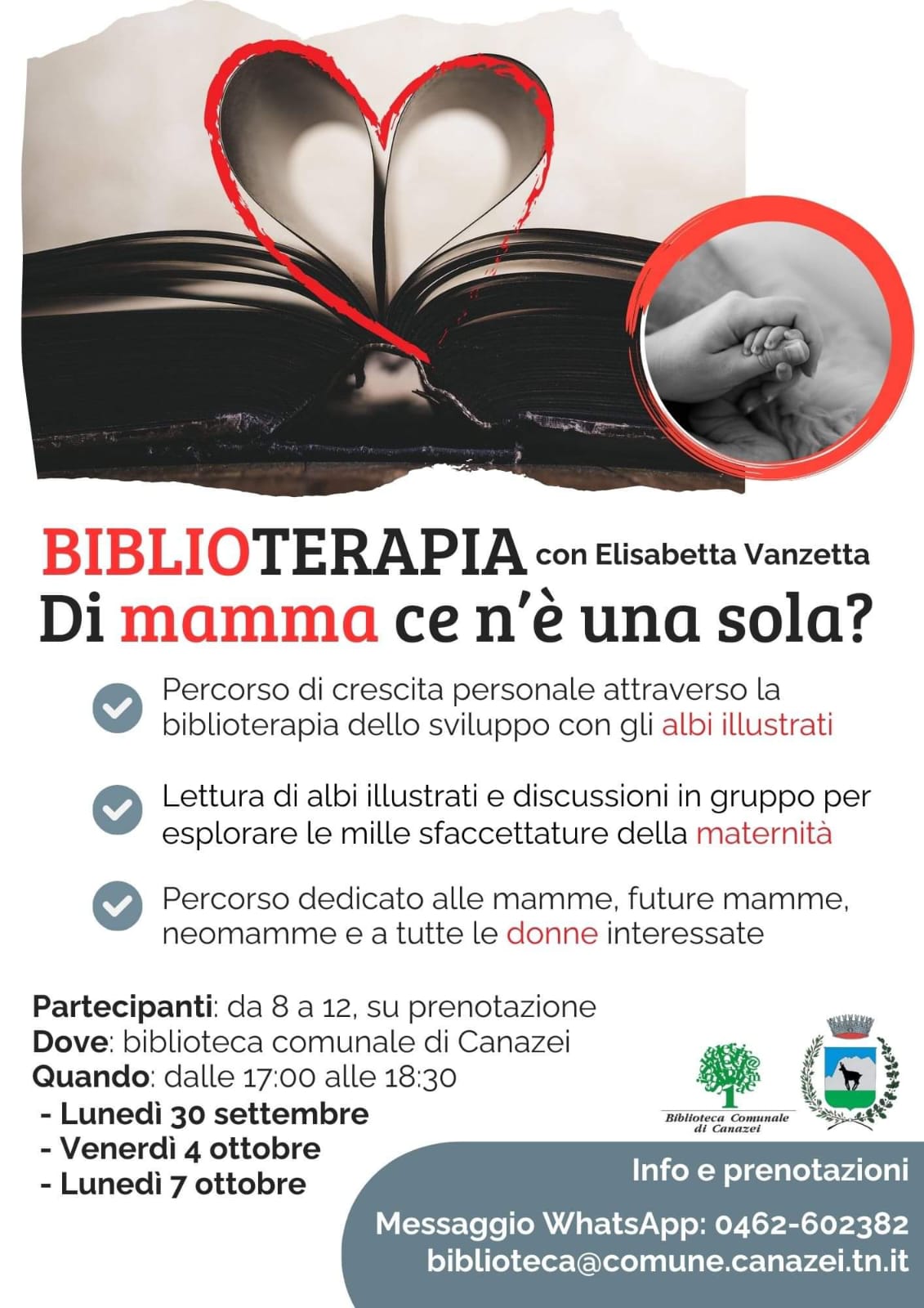 La biblioteca di Canazei organizza un ciclo di tre incontri con Elisabetta Vanzetta, sul tema della maternità: il 30.09.2024, 04.10.2024 e 07.10.2024 dalle ore 17.00 alle ore 18.30